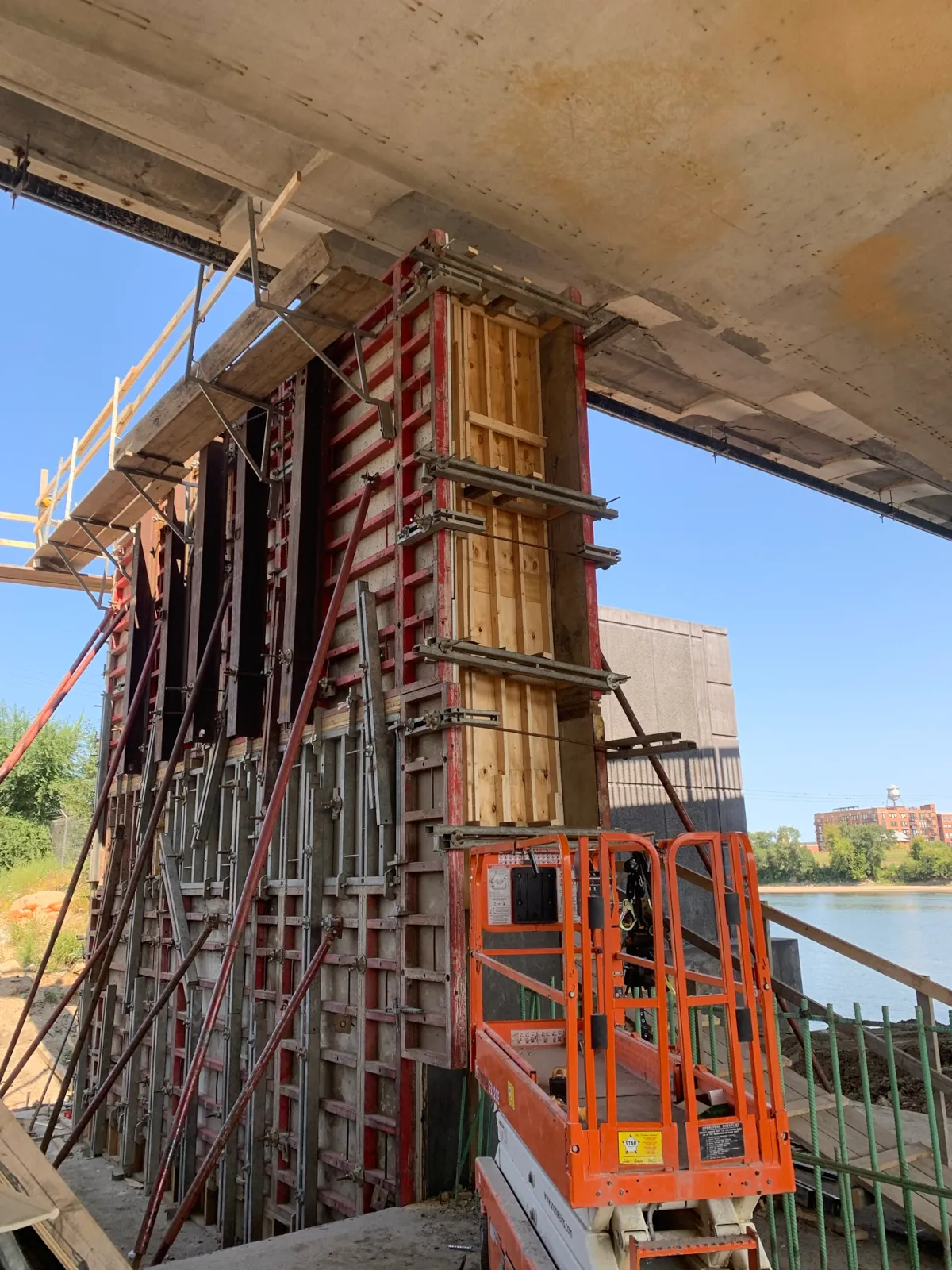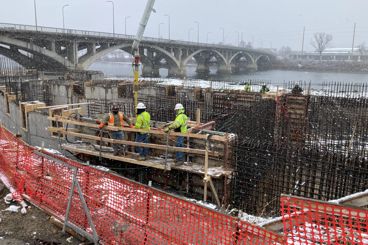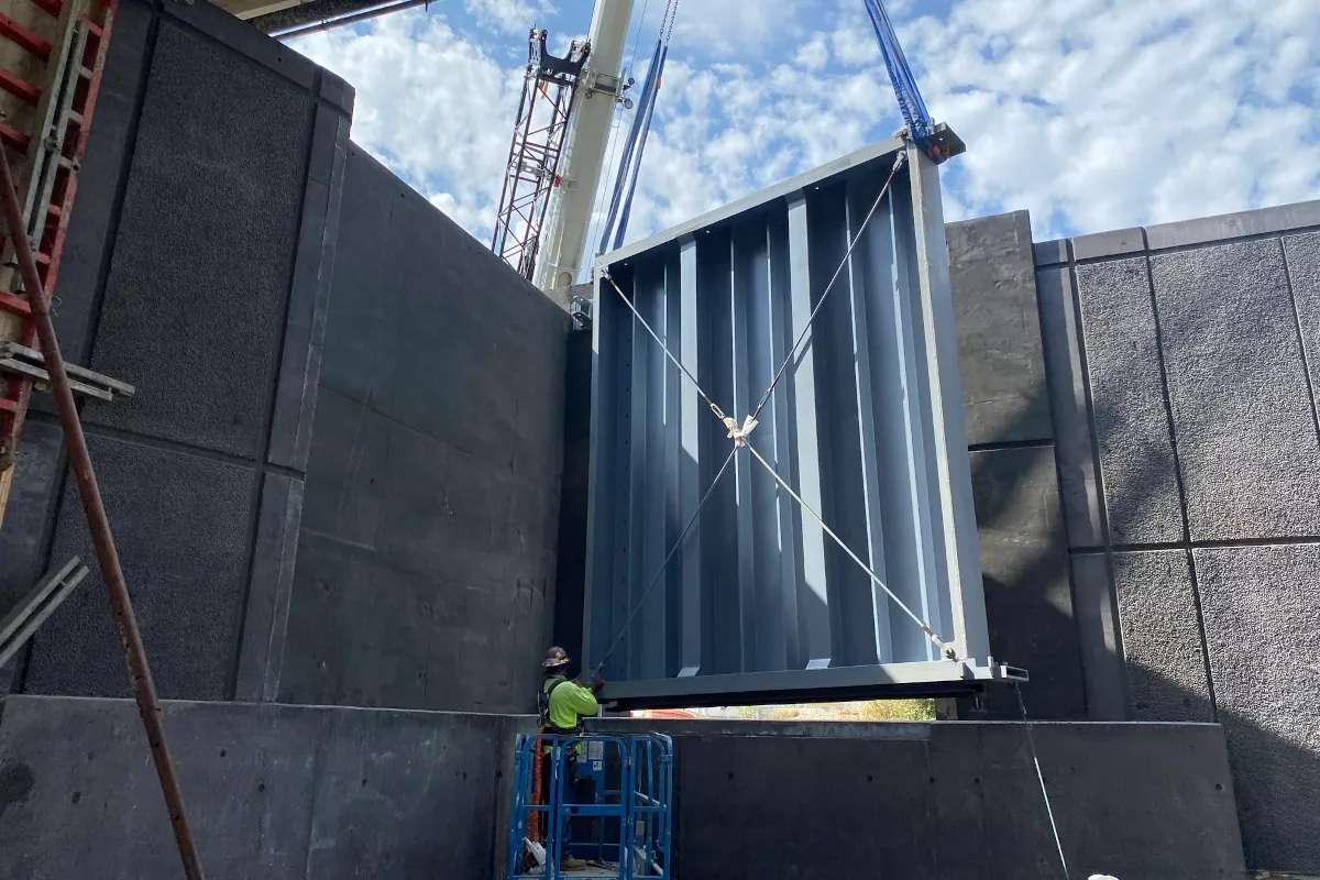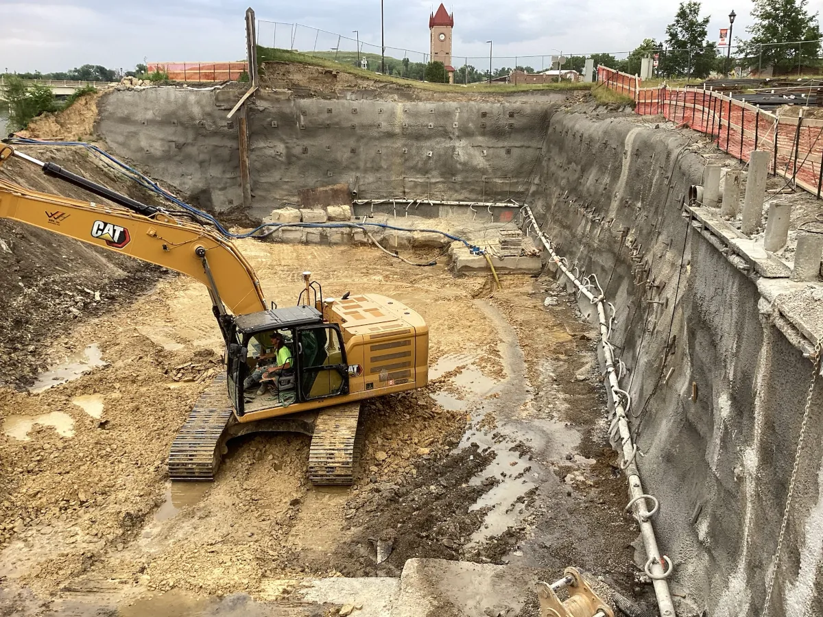 Building so close to the river presented extraordinary challenges. Situated less than 30 feet from the water’s edge and nearly 10 feet below river elevation, the site demanded exceptional planning, precision, and flexibility. Over more than two years of excavation and construction, Wendler’s team worked under constantly shifting conditions, including extreme weather, rising and falling river levels, repeated flood events, and the persistent challenge of groundwater intrusion. Temporary berms, dewatering systems, and Hesco barriers were deployed multiple times to protect both the work zone and the city’s existing flood defenses, ensuring public safety and flood system integrity were never compromised.